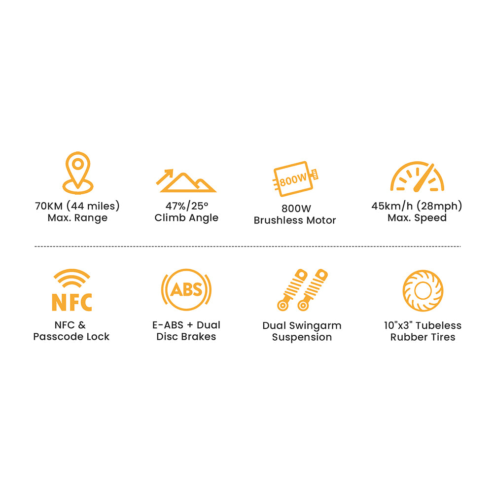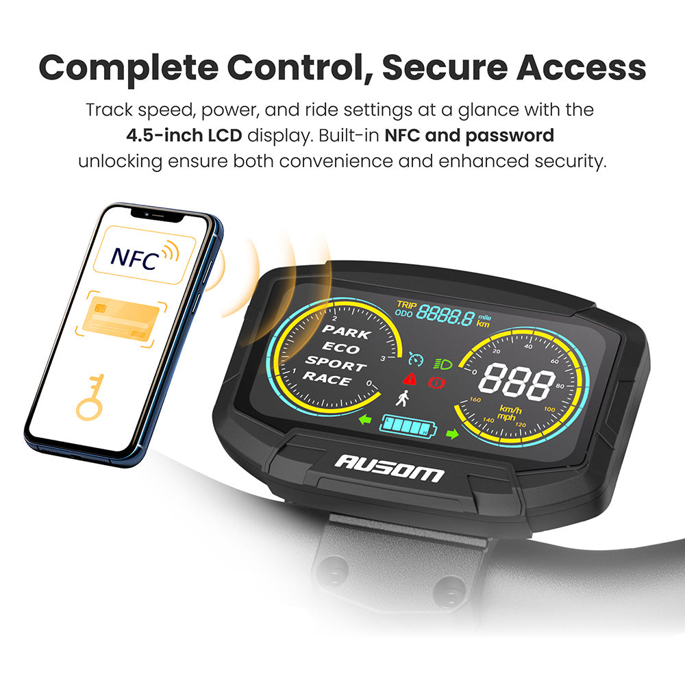 Der 4,5-Zoll-LCD-Bildschirm zeigt Geschwindigkeit, Akkustand und Fahrmodus übersichtlich an. Der verstellbare Lenker und die verstellbare Sitzhöhe passen sich Fahrern von 150 bis 200 cm (4'11"-6'7") an. Mit einem Klick-Klappmechanismus und einer maximalen Tragkraft von 130 kg (287 lbs) ist es sowohl komfortabel als auch tragbar.