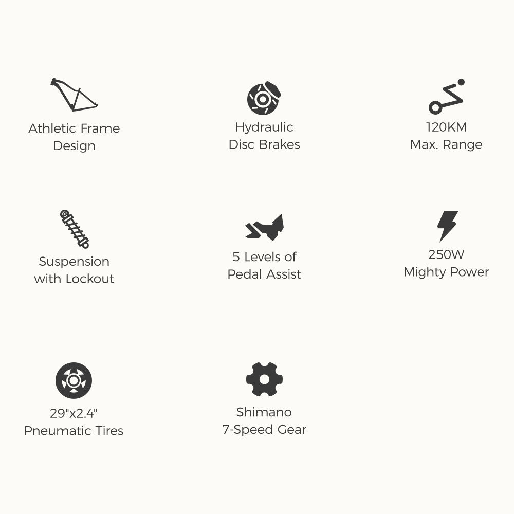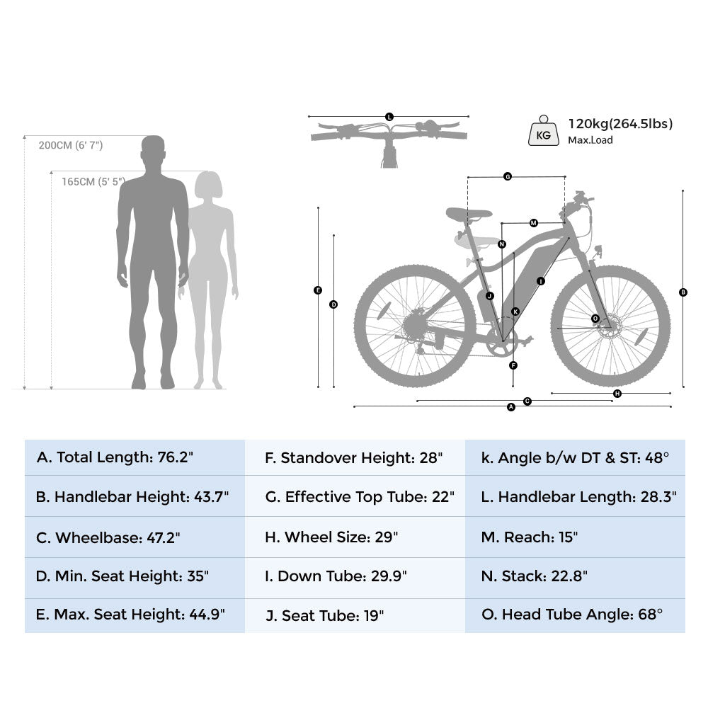 | Reifen | Größe: 29"x2.4" Typ, Material: Luftgummireifen Reifendruck: 30–45 PSI Bester Reifendruck: 35–40 PSI |