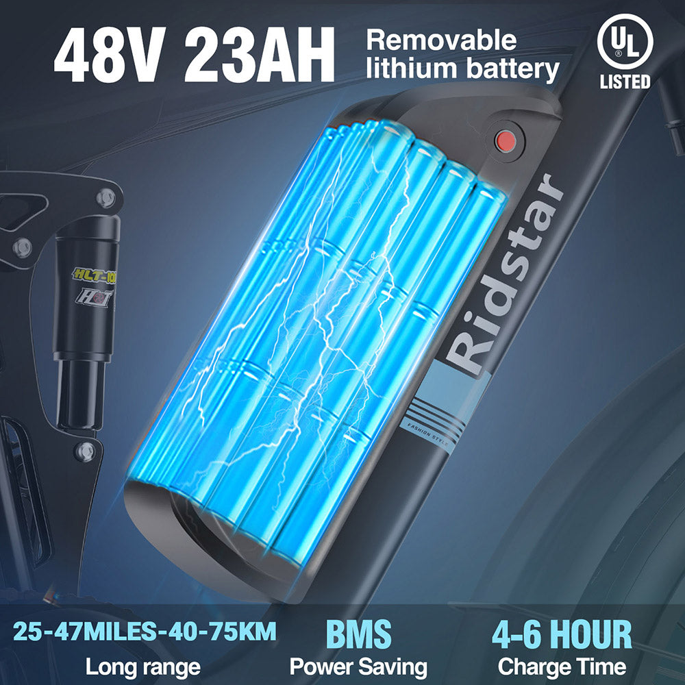 Das Ridstar E26 Pro Mountainbike ist mit einem austauschbaren 48-V-23-Ah-Akku mit einer Reichweite von 40–75 km ausgestattet. Ideal für den Weg zur Arbeit und Bergabenteuer.