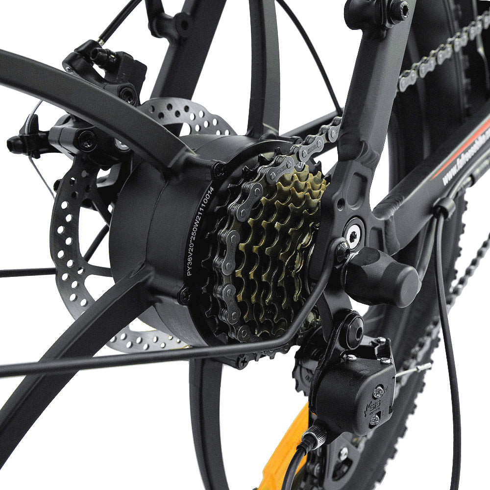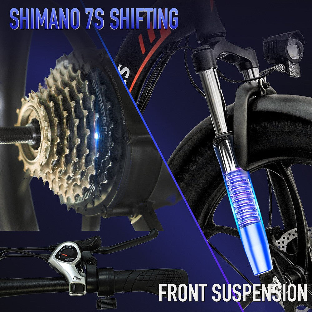 2. Cambios de 7 velocidades: F20 posee un sistema de transmisión profesional de 7 velocidades, el desviador con revestimiento resistente al óxido está unido al marco y la palanca de cambios está integrada en el manillar. El suave juego de 7 velocidades te permite cambiar mientras viajas con facilidad y pedalear más cómodamente en cualquier terreno, como colinas, caminos con baches y pendientes.