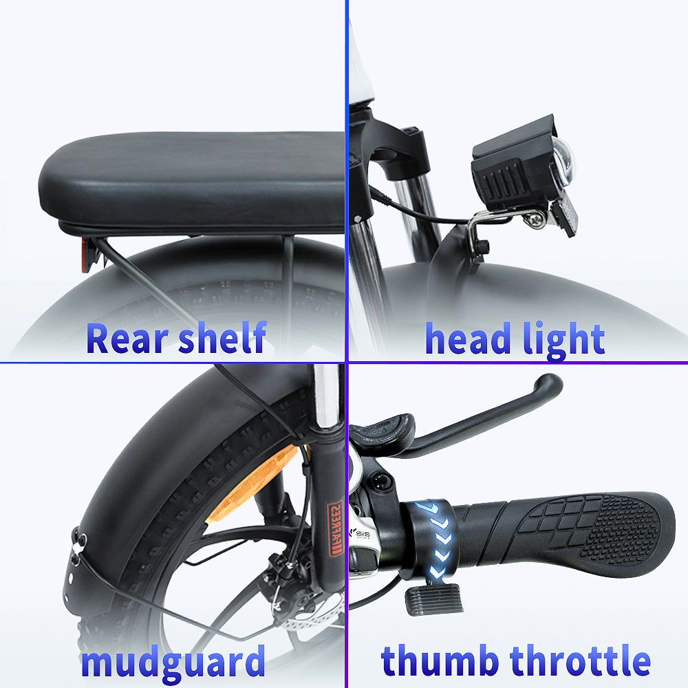 4. Ruedas de 20"*3.0 con neumático antideslizante: Las ruedas de 20" hacen que el F20 se convierta en un transporte perfecto, eficiente y económico para ir al trabajo, la escuela o la ciudad. Combinado con neumáticos antideslizantes resistentes al desgaste y guardabarros duraderos, puede conquistar fácilmente canaletas, baches y cualquier otra carretera del entorno urbano.