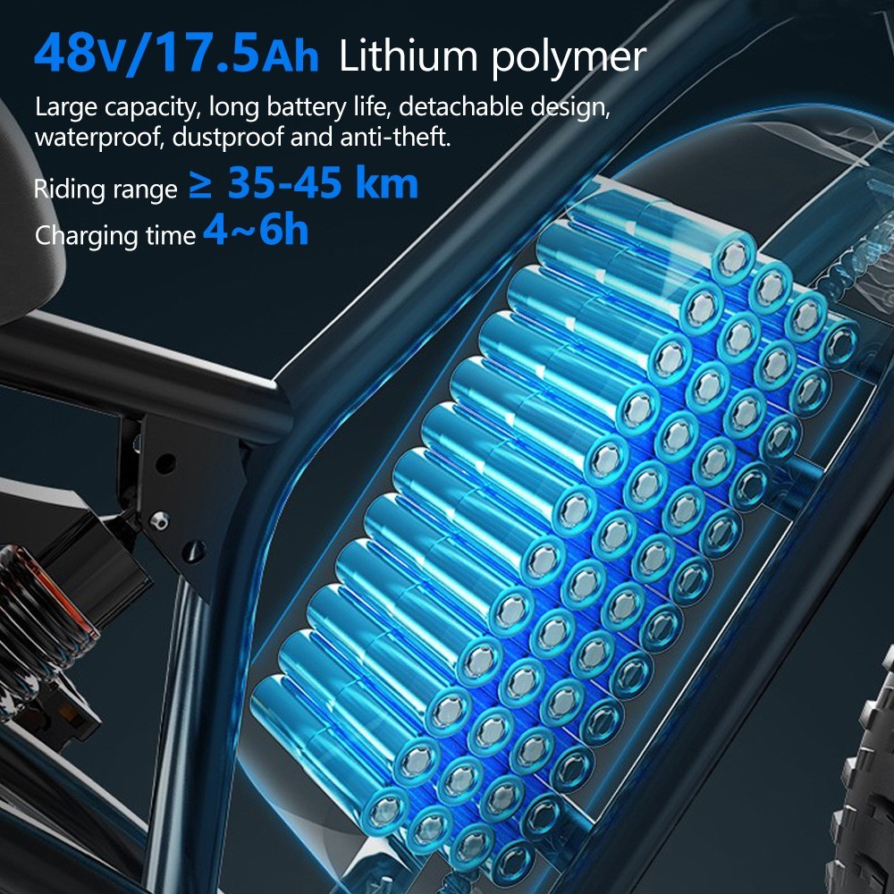 Large capacity, long battery life for 35-45km mileage, detechable design, waterproof and anti-theft.