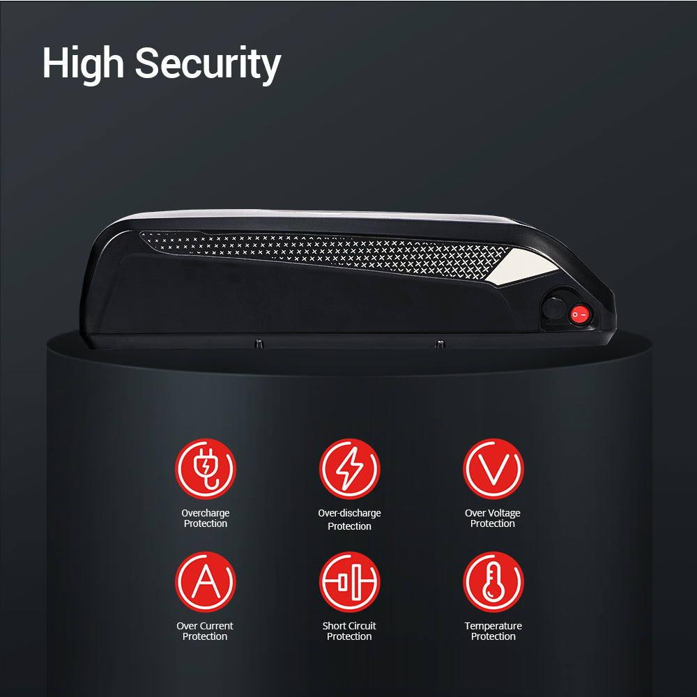 【High Security】Coming with a good-quality case and a safety lock, the battery pack is under a good protection. The lock can also keep the battery mounted steadily and removed easily. Besides, the charging port is tightly covered by a rubber clog to keep the dust and water out of it. And each battery pack is designed with a professional protection system, leaving you a strong sense of safety.