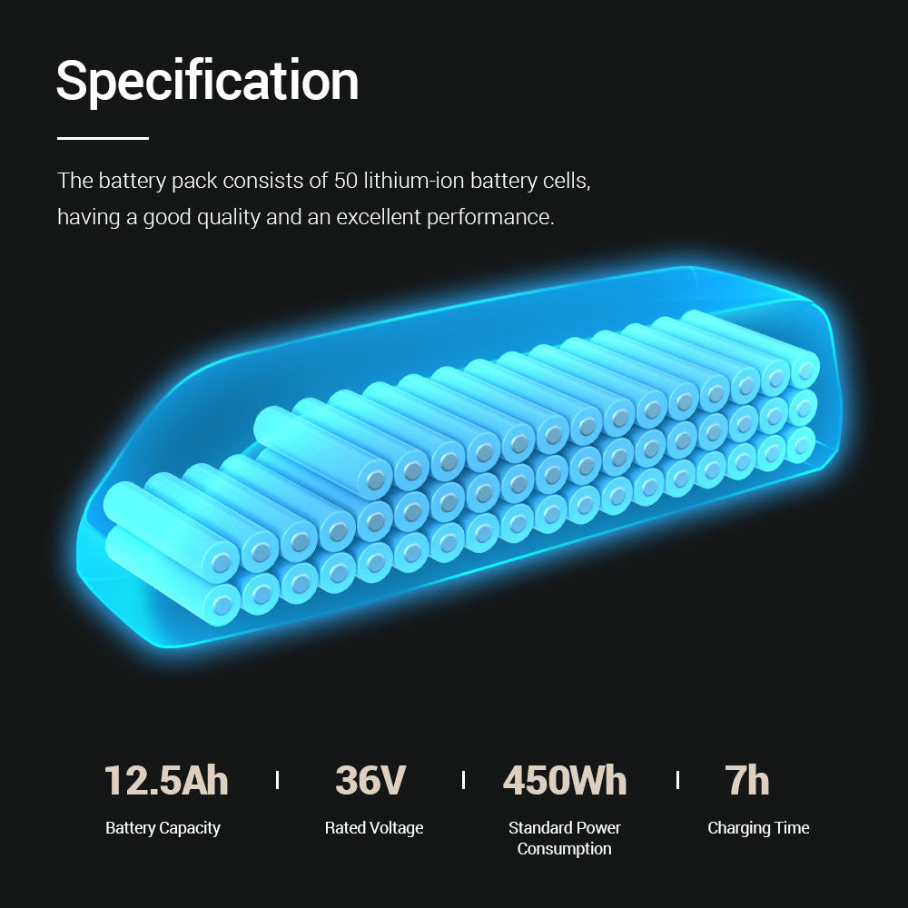 【Parameter】The e-bike battery is 36V, 12.5Ah. The standard power consumption is 450Wh. It has a dimension of 14.47in x 3.55in x 3.52in (36.75cm x 9.03cm x 8.95cm). It normally takes 7 hours to get the battery fully charged.