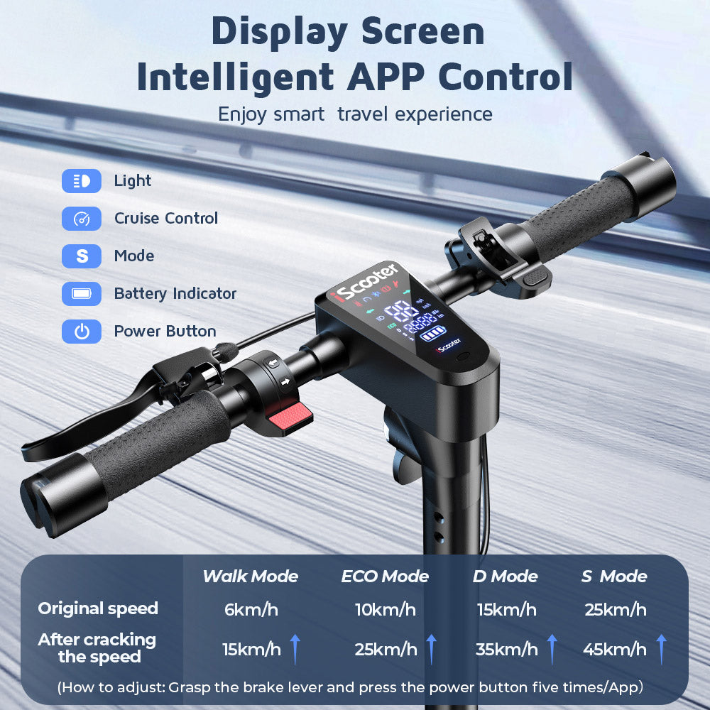 iScooter APP controls, four-speed mode, battery level, map navigation, distance, cruise control, lighting mode and more.