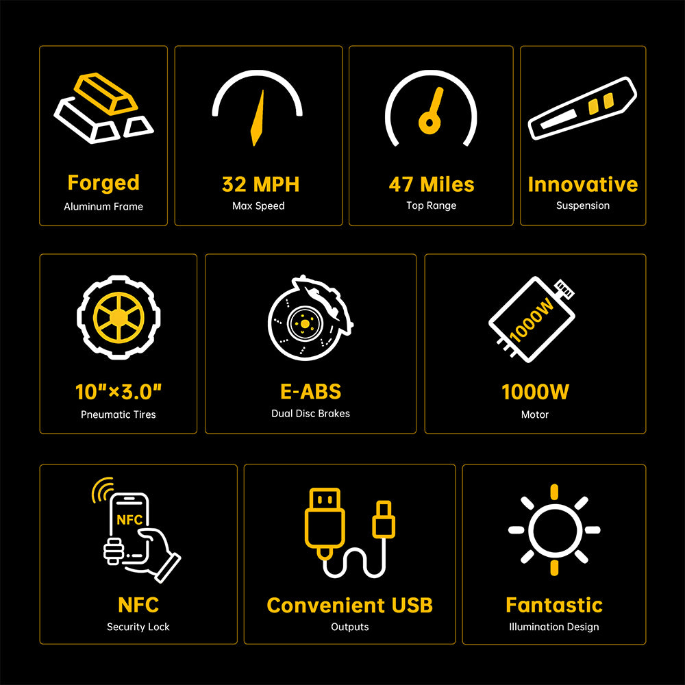 Regarding safety, the e-scooter is equipped with disc brakes and EABS for a smooth ride and enhanced off-road capabilities. Coming with a bright headlight, taillight, and turn signal light, the electric scooter allows for safe nighttime riding. The NFC security lock can be unlocked using a smartphone or NFC card, enhancing the security of the e-scooter and blocking the unauthorized use of the e-scooter. It also includes a parking gear, i.e. the e-scooter will automatically stop without operation for 30 seconds, for added safety.