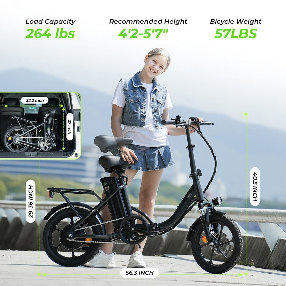 Motor: 250W (Peak 500W) Battery: 36V 10.4Ah Max Load: 120kg Range: 55-88km Max Speed: 25km/h Gear: 6/10/15/25km/h Recommended Rider Height: 140cm~180cm Charging Time: 4-5H Tires: 16*2.15" Inflatable tires Frame: Aluminum alloy Screen: Large LCD screen Brake: Disc Brakes |