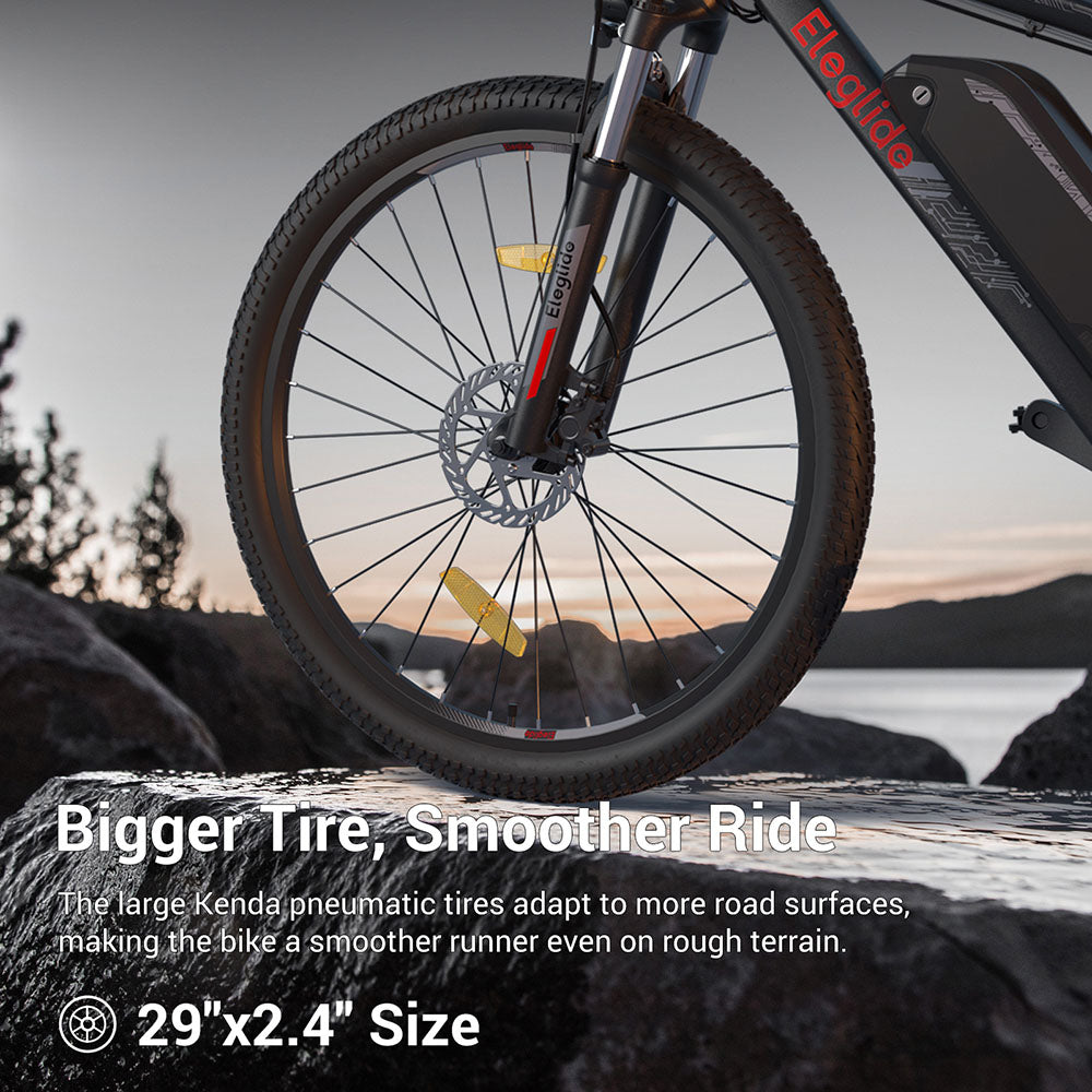With 29-inch wheels, the Eleglide Mopride 2 (29") bike can negotiate trail obstacles with ease and stability. The 2.4-inch wide pneumatic rubber tires provide greater traction for a smooth and comfortable ride, even on rough terrain. Moreover, the knobby tire surface drastically reduces the impact caused by road bumps, making your ride even more enjoyable.