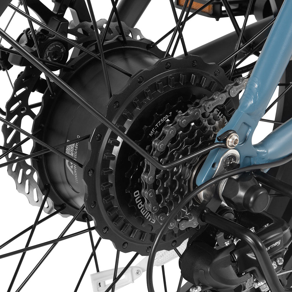 The DYU FF500 Fat Tire Electric Bike is equipped with a 500W motor, providing ample power for smooth and enjoyable rides, even on challenging surfaces such as sand, snow, and gravel roads. The fat tires offer added stability and control, ensuring a comfortable ride no matter the terrain.