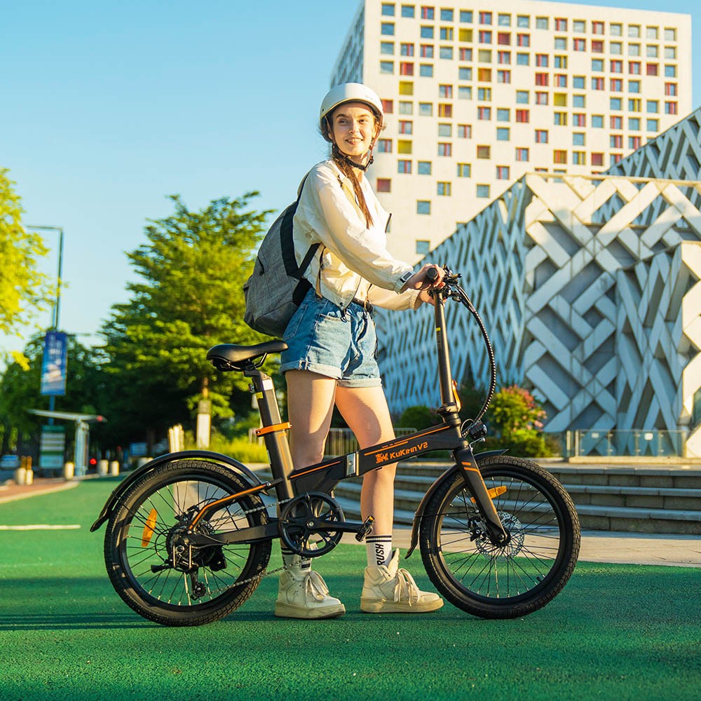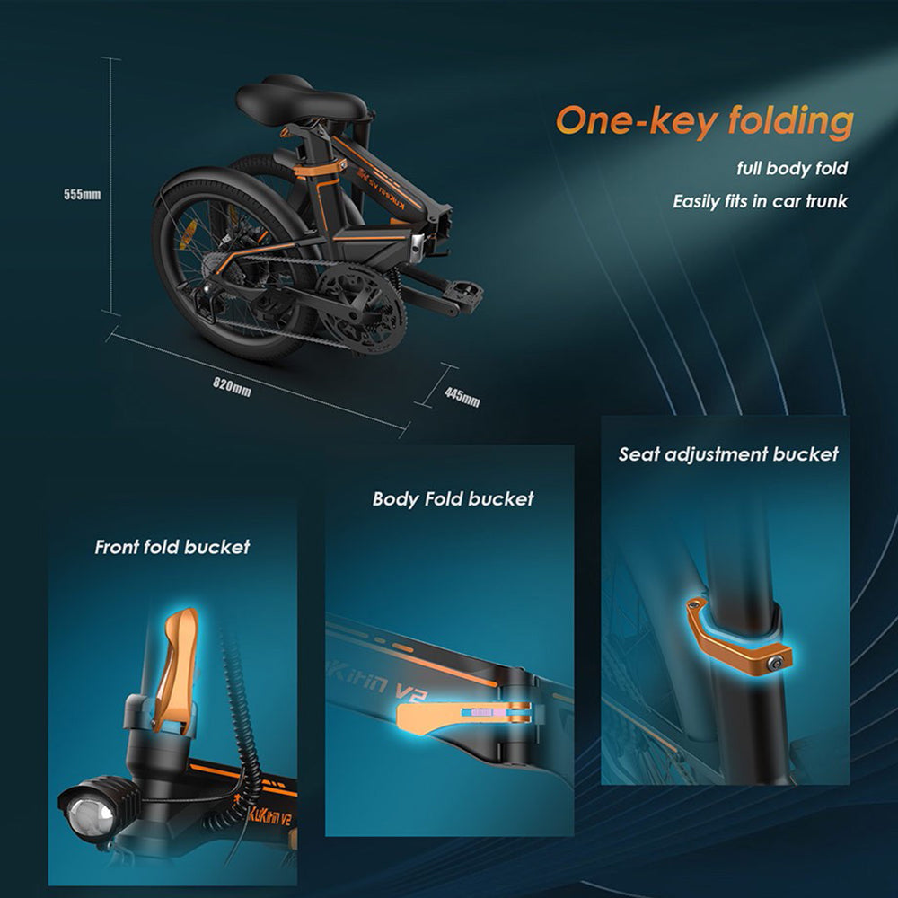 The KuKirin V2 city and off-road electric bike features a foldable body frame and handlebars, allowing for easy transportation in your car trunk during city trips or countryside adventures, and when not in use, it can be folded effortlessly to save you valuable storage space.