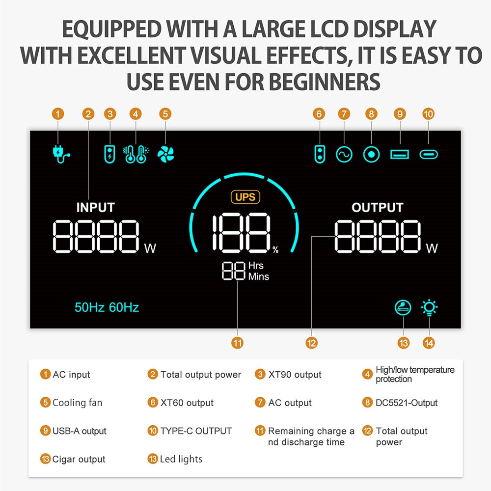 Capacity: 2160Wh Cell Type: LiFePo4 AC Charging: AC mains input, 1100W max MPPT Input: 11.5-50V/20A/500W max AC Output: 50/60Hz (switchable), rated 2400W, pure sine wave with overload, short circuit protection USB QC3.0: 18W*2 Type-C: PD 20W*3 Type-C: PD 100W*1 DC 5521: 12V/3A*2 XT60 Output: 12V/25A Car Charging Output: 12V/10A Shutdown Current: <500uA Working Temperature: -10 - 40 Celsius Environment Humidity: ≤90%RH Cycle Times: >3500 Times |
