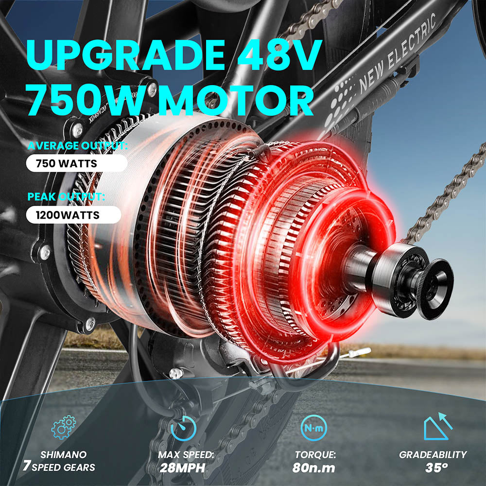 | Specification | Battery: 48V 13A Lithium Battery Mile Range: 30+ miles Motor: 750W Brushless Motor Throttle: Half-Twist Throttle Pedal Assist level: 1~5 Level Front Fork: Mechanical Suspension Front Fork Saddle: PVC Soft Leather Pedal: Foldable Aluminum Alloy Pedals Crank: 170mm Forged Alloy Max Payload Capacity: 330lbs Recommended Rider Heights 5'4" ~ 6'5" Tires: 20" x 4" Fat Tires Gear Shifting System: Shimano 7 Speed Gear Rear Light: Signal Turn Light/48V LED Light Head Light: 48V LED Light Front Light: 48V LED Light |
